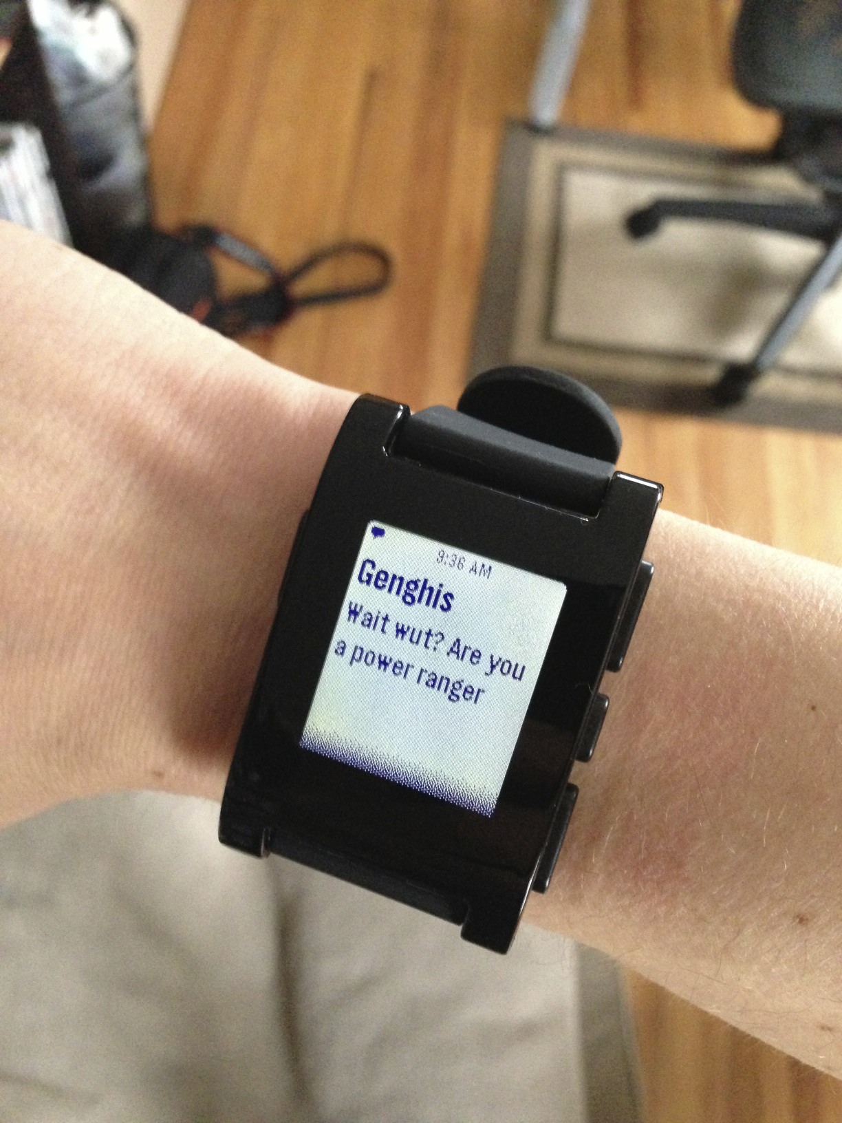 My Pebble watch arrived yesterday. This was a project that I kickstarted back in May of 2012. While moderately behind schedule, they’ve delivered a functioning, elegant product which does what it was supposed to.
